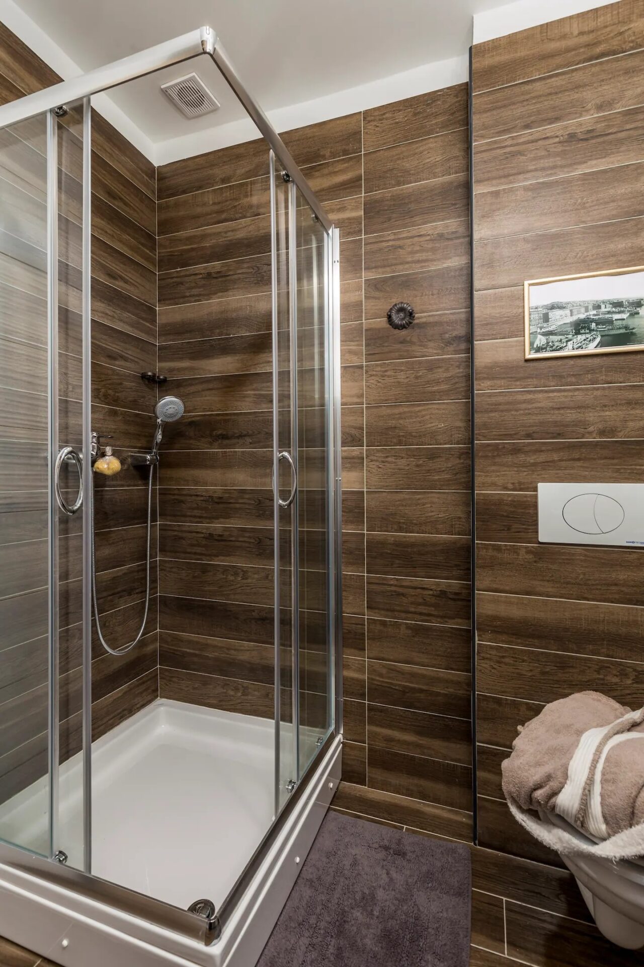Kupaonica s tuš kabinom i WC s perilicom rublja.